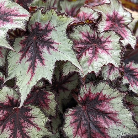A large leaved rex-type begonia houseplant with variegated silver leaves, centre