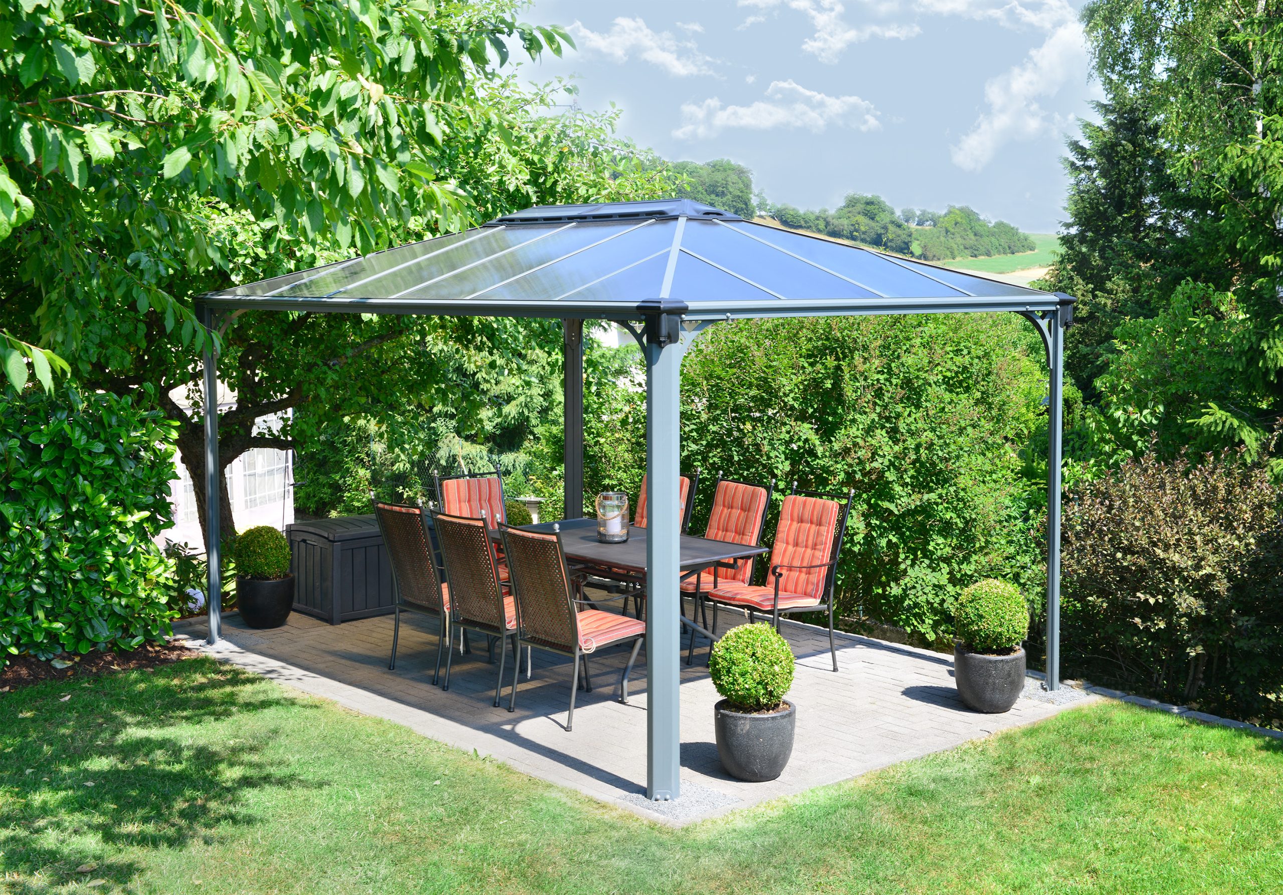 Martinique Garden Gazebo allows you to turn your outdoor area into a roomy gathering space. It provides an addition to your home and lifestyle, a smoking shelter or a private getaway. This gazebo is crafted to deliver elegance and utility to your garden year-round; it is sturdy and durable, comprised of anthracite powder coated structure, combined with virtually unbreakable twin-wall Polycarbonate roof panels, which protect your patio furniture from harsh weather conditions for many years of carefree enjoyment.