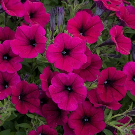 A trailing, magenta-crimson petunia bedding plant for baskets and pots