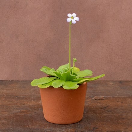 A tender carnivorous houseplant with fleshy leaves and bluish white flowers